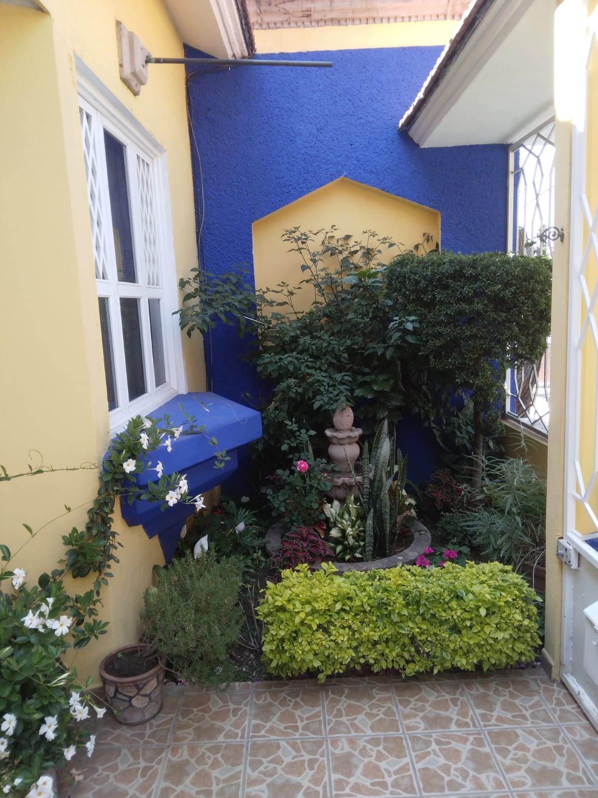Planta baja: cochera 2 autos una de ellas techada y portón eléctrico, jardín con fuente , estudio, medio baño, sala con chimenea , comedor, cocina, terraza y hermoso jardín con área de desayunador.